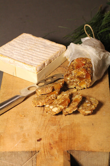Gâteau roulé au caramel de fruits secs au chocolat et poudre de nougatine