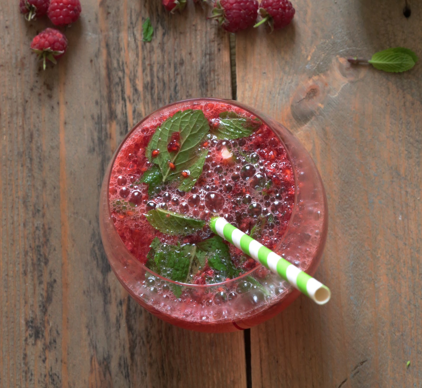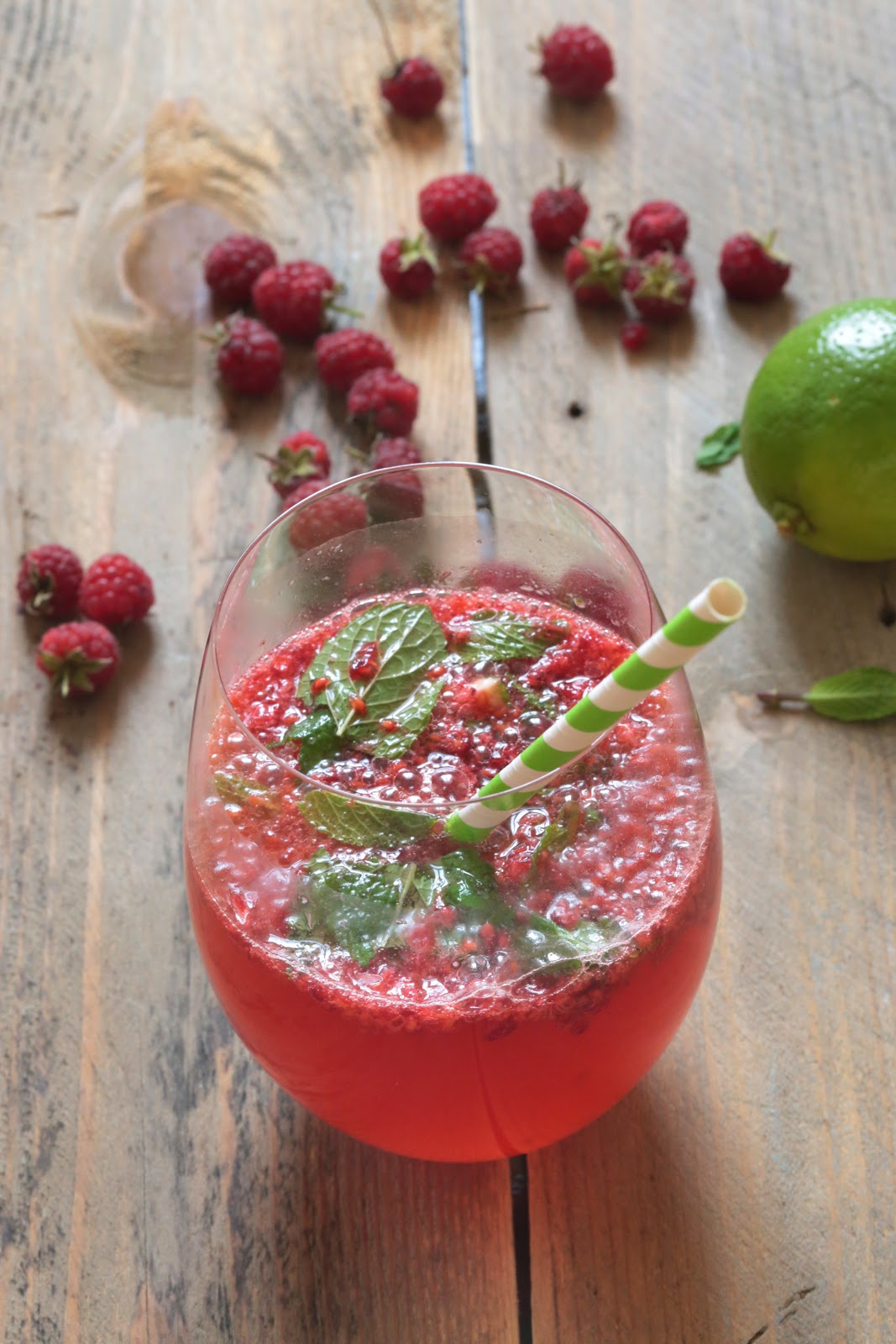 Dans un verre versez les framboises , et le sucre de canne, ajoutez le demi citron coupé en petits morceaux , écrasez le tout avec un pilon . Ajoutez les feuilles de menthe (déchirées avec vos doigts ) puis l'eau gazeuse et éventuellement des glaçons si l'eau n'est pas assez fraîche .